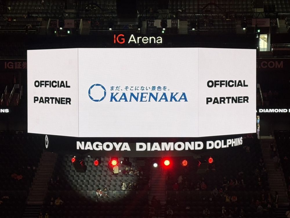 弊社かねなかは名古屋ダイヤモンドドルフィンズのオフィシャルパートナーをさせていただいているので、なんとハーフタイムの時に正面の画面にバーンと弊社のロゴが映し出され、個人的には感動しました!弊社はデジタルサイネージのみでしたが、色んな広告の出し方があるみたいで、ゴールが決まった際に音楽と共に会社名をみんなで歌う演出がある企業さんなどもあり印象的でした。
